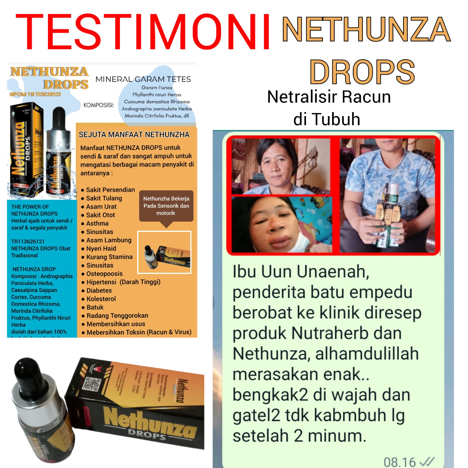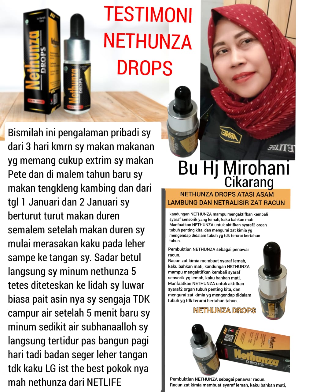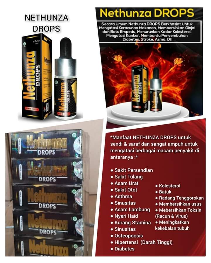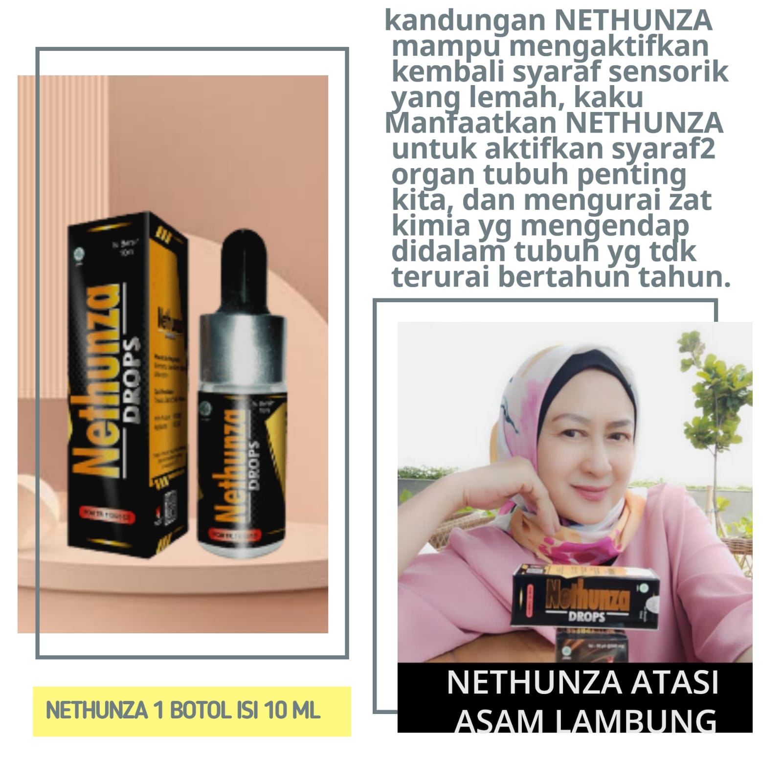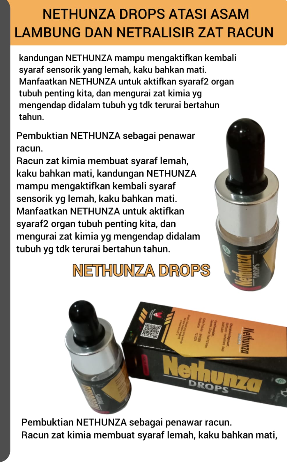 Racun zat kimia membuat syaraf lemah, kaku bahkan mati, kandungan NETHUNZA mampu mengaktifkan kembali syaraf sensorik yg lemah, kaku bahkan mati. Manfaatkan NETHUNZA untuk aktifkan syaraf2 organ tubuh penting kita, dan mengurai zat kimia yg mengendap didalam tubuh yg tdk terurai bertahun tahun. NETHUNZA juga digunakan sebagai penghancur batu ginjal dan empedu, sudah terbukti beberapa pengguna yg mendapatkan hasil bagus dalam waktu 3-5 hari penggunaan